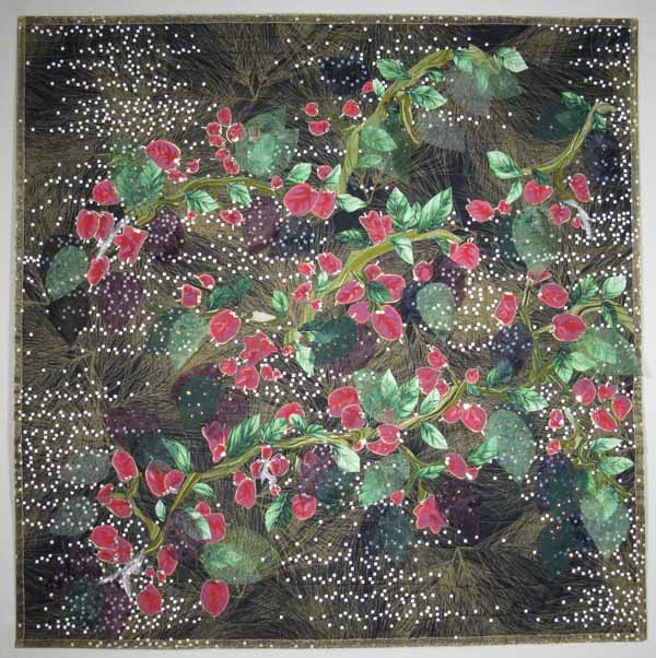 I created a leafy background for the branches of the Bayberry. The yellow blossoms progress to green immature berries and then to mature red berries. It was fun to bead the green berries and to create slightly different color and texture of red berries. The thorns are a sharp reminder when you touch Bayberry that this plant means business.